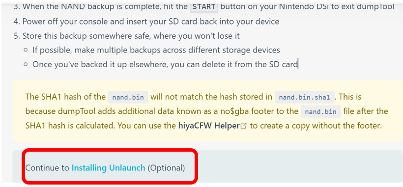 Dumping NAND This page is for making a NAND backup, which is a copy of the data on the Nintendo DSi's internal storage. It can be used to set up hiyaCFW, as well as no$gba and melonDS for DSi emulation. TIP Make sure the SD card has at least 250MB of free