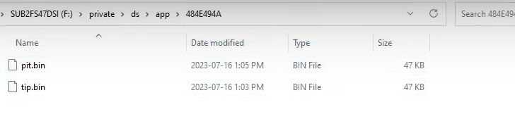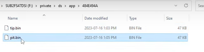 > private폴더 > ds폴더 > app폴더 > 숫자xxxx (기기마다 다를수있음) > pit.bin 파일이 있다.