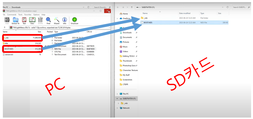 >SD카드를 PC에 꼽고 > 위에 TwiLight Menu++ 다운받은걸 압축푼다