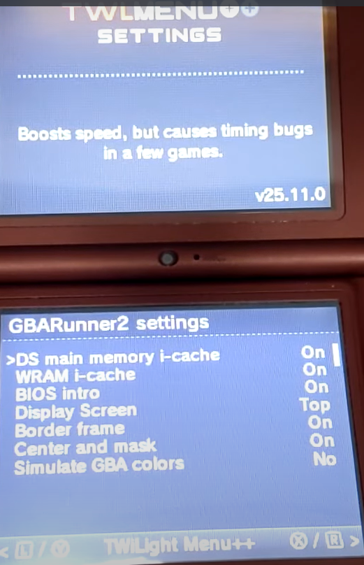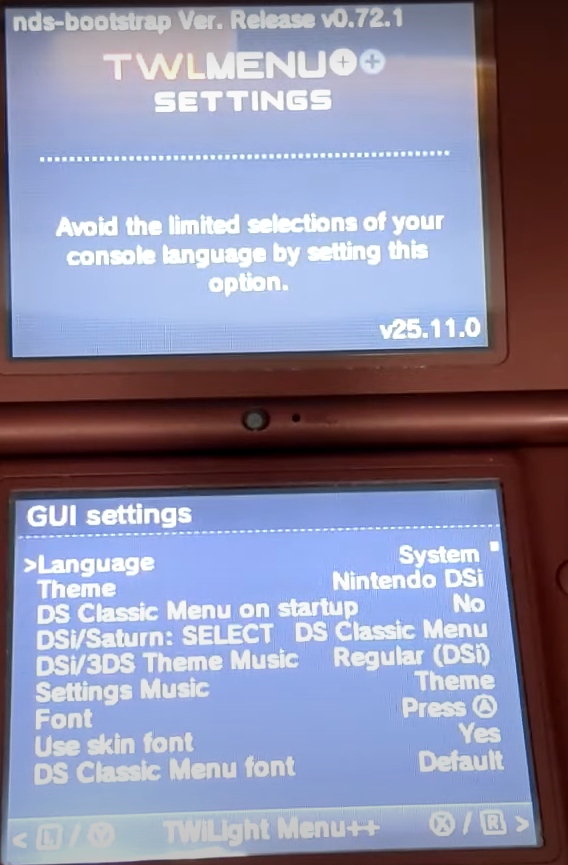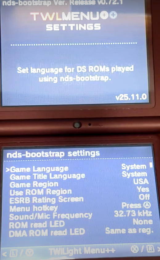 > 이제 TWiLight Menu++ 를 선택해 A버튼 누른다.