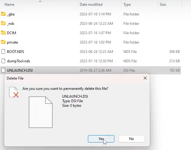 >SD카드에 UNLAUNCH.DSi 파일을 지운다.
